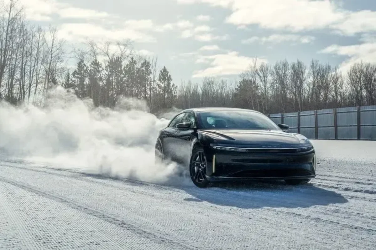 در آزمایشی که خبرنگاران همراه با مهندسان لوسید در پیست زمستانی انجام دادند، روی برف فشرده مشکل چندانی دیده نشد؛ چون هنوز مقداری اصطکاک وجود داشت. اما شبیهسازی تعویض خط روی یخ صیقلی، بلافاصله باعث لغزش عرضی شد.
