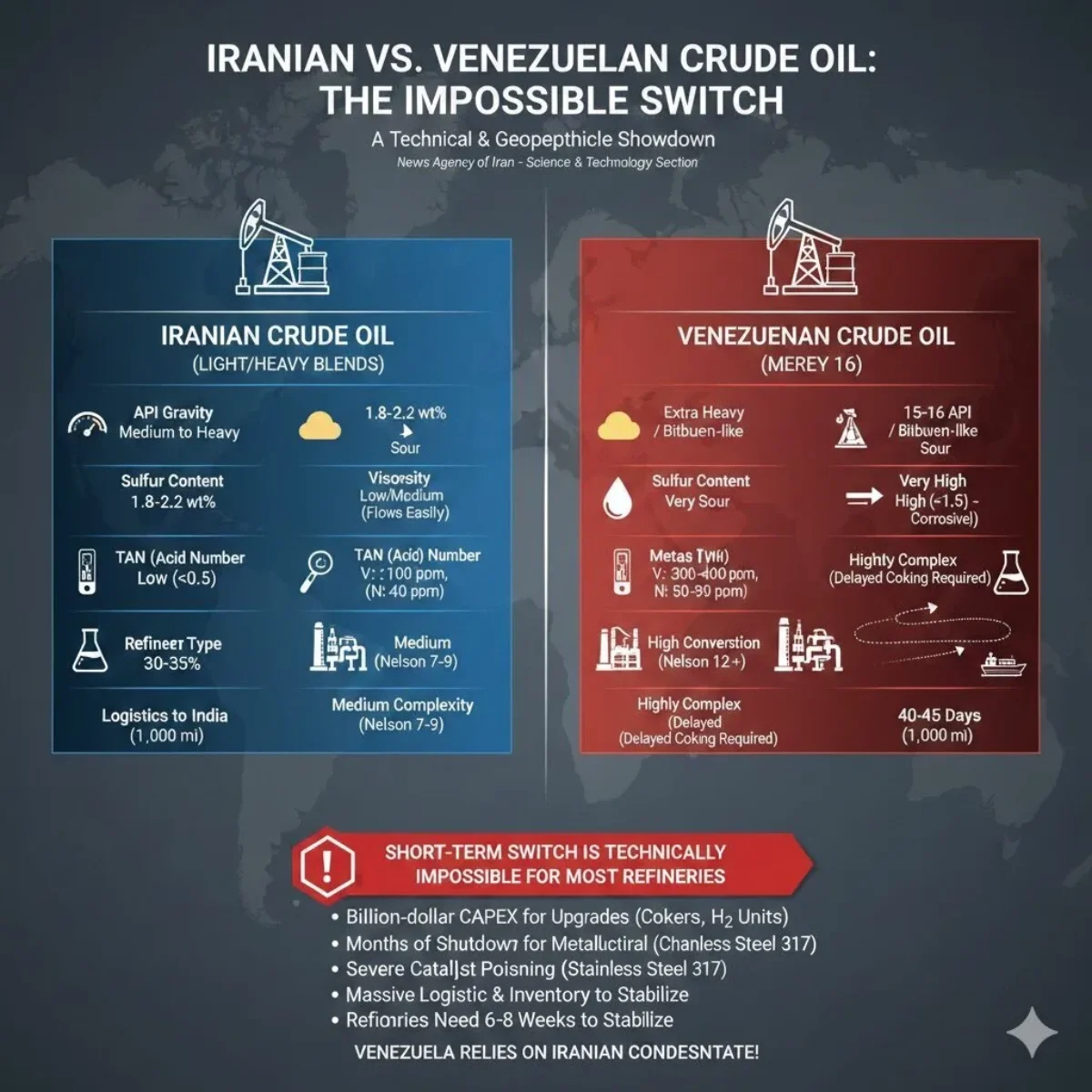 دونالد ترامپ، رئیسجمهور آمریکا مدعی شده بود که هند دیگر نفت ایران را خریداری نخواهد کرد و به سراغ نفت ونزوئلا خواهد رفت؛ اما بررسیهای متالورژیکی و شیمیایی حاکی از آن است که این حرف دستکم در بازه زمانی کوتاهمدت، امکانپذیر نیست و فراتر از یک تصمیم دیپلماتیک، با سدهای محکم مهندسی و عملیاتی روبروست.