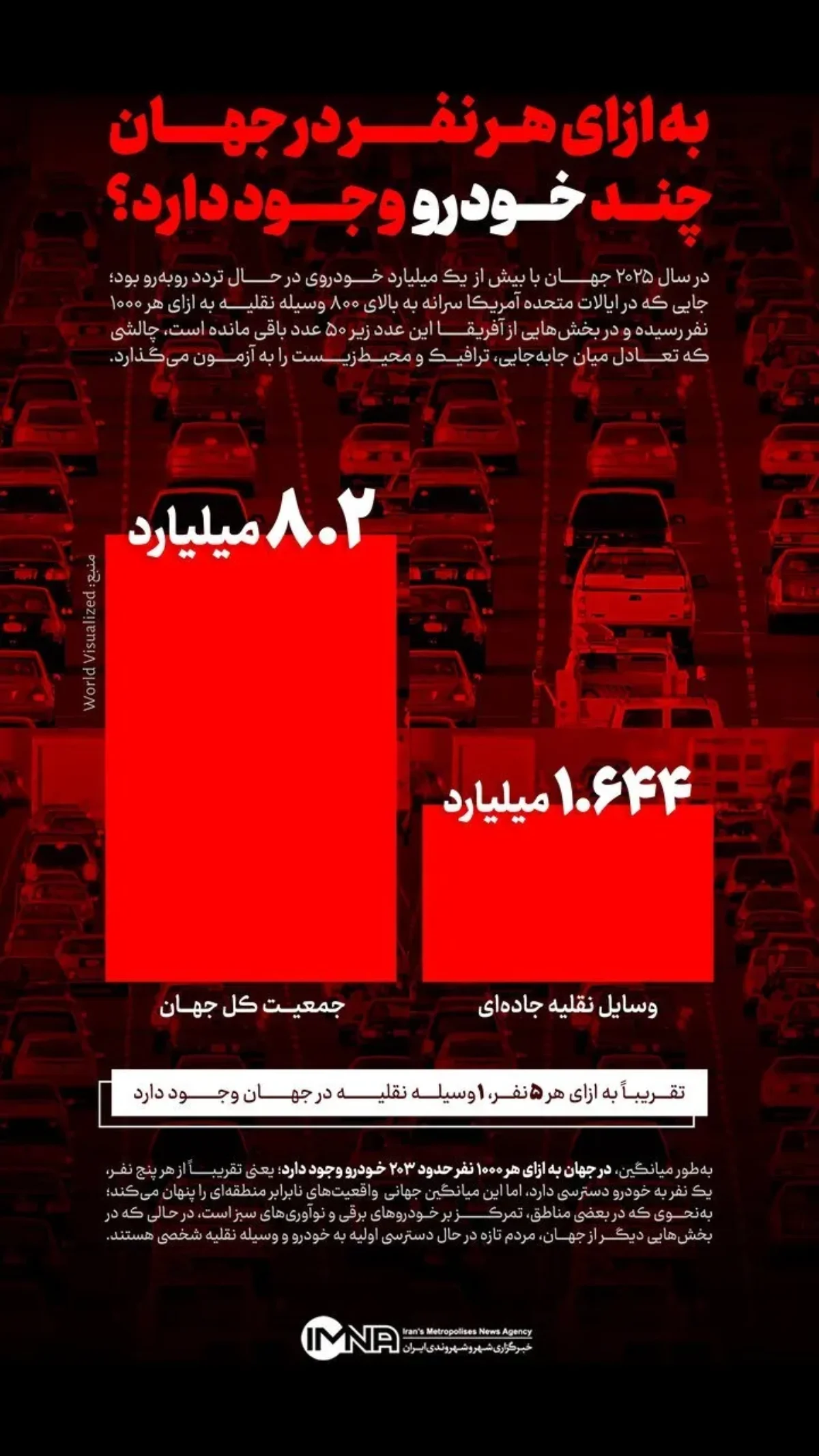 در حالی که جمعیت جهان به حدود ۸.۲ میلیارد نفر رسیده، تعداد وسایل نقلیه جادهای فعال در دنیا از ۱.۶۴۴ میلیارد دستگاه عبور کرده است. این آمار نشان میدهد بهطور میانگین تقریباً بهازای هر پنج نفر، یک خودرو در جهان وجود دارد؛ عددی که از رشد حملونقل شخصی و چالشهای ترافیکی خبر میدهد.