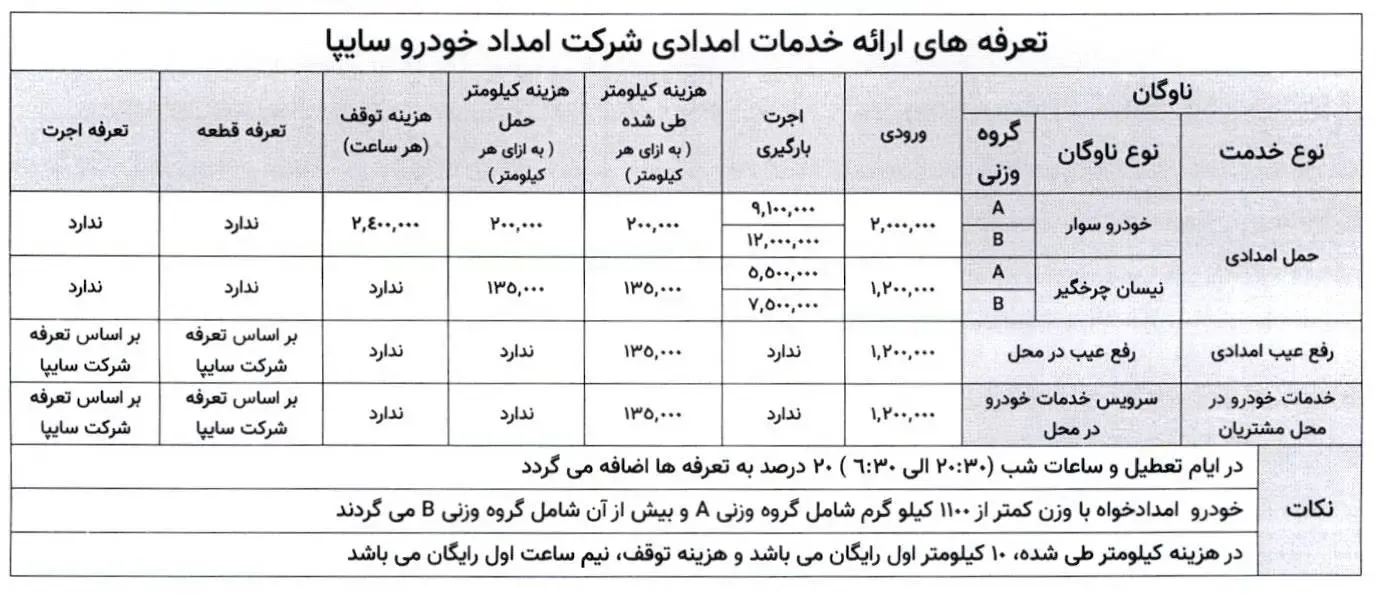 این تعرفهها مربوط به خدمات شرکتهای امداد خودرو ایران و امداد خودرو سایپا بوده و شامل نرخ ناوگان امدادی، مبنای محاسبه هزینه حمل خودرو با جرثقیل و خودروبر، ایاب و ذهاب، خدمات امدادی در جادههای بینشهری، خدمات در محل داخل شهر و سایر خدمات مرتبط است.