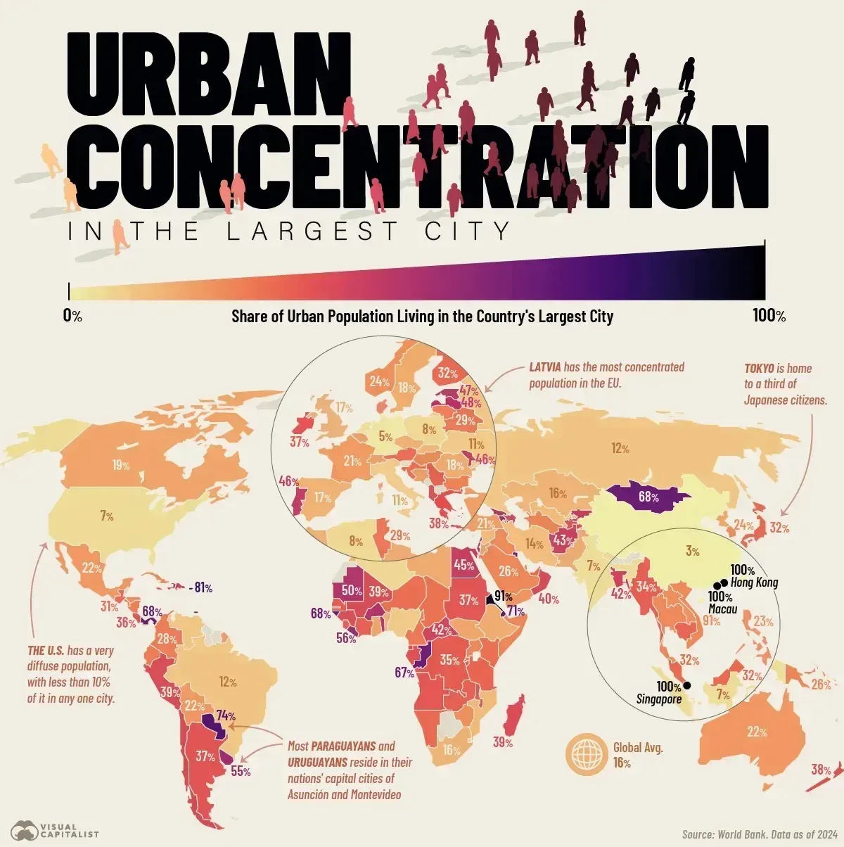 در سطح جهانی، تنها ۱۶ درصد از جمعیت کشورها در بزرگترین شهر کشور خود زندگی میکنند. این موضوع نشان میدهد که در اغلب کشورها، جمعیت و فعالیت اقتصادی میان چندین مرکز توزیع شده و در یک شهر متمرکز نشده است.